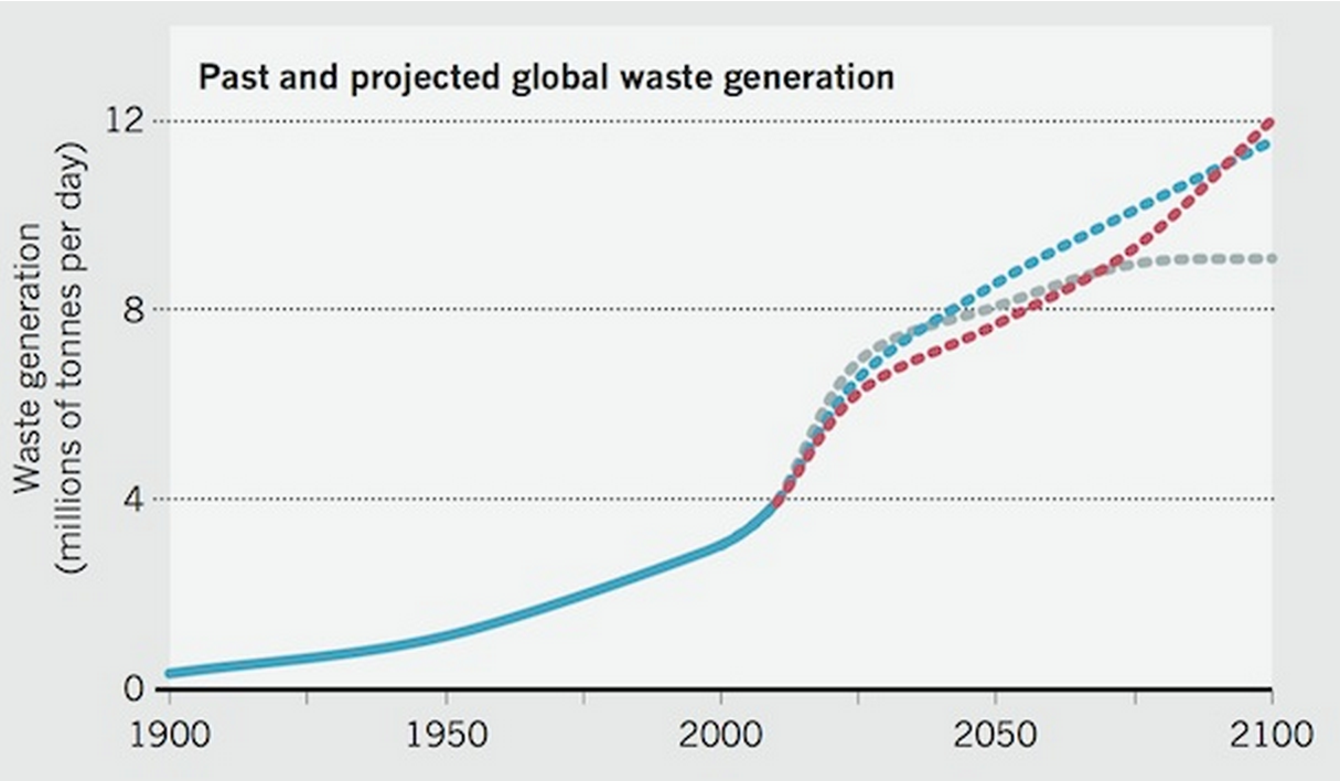 ธนาคารโลกได้ทำการประมาณการปริมาณขยะออกไปในปี 2100 ดังแสดงไว้ในภาพที่ 1 ซึ่งแสดงปริมาณขยะของโลกต่อวัน เส้นประสีฟ้าแสดงกรณีที่เศรษฐกิจและสังคมยังคงดำเนินไปอย่างปกติ (business-as-usual : BAU) เส้นสีแดงแสดงกรณีที่ประชากรเพิ่มขึ้นอย่างต่อเนื่อง และ เส้นสีเทาแสดงกรณีที่ประชากรเพิ่มขึ้นไม่มาก และมีการใช้ทรัพยากรอย่างมีประสิทธิภาพใส่ใจต่อสิ่งแวดล้อม จากการศึกษาพบว่าในกรณี BAU ปริมาณขยะต่อวันจะเพิ่มเป็นมากกว่า 11 ล้านตันต่อวันในปี 2100 เพิ่มขึ้นกว่า 3 เท่าตัวจากปัจจุบัน อย่างไรก็ดีหากเป็นกรณีที่ประชากรเพิ่มขึ้นไม่มาก และ มีมาตรการที่ส่งเสริมให้เกิดการใช้ทรัพยากรอย่างมีประสิทธิภาพมากขึ้น ก็จะทำให้ ปริมาณขยะลดลงได้ 2.6 ล้านตันต่อวัน