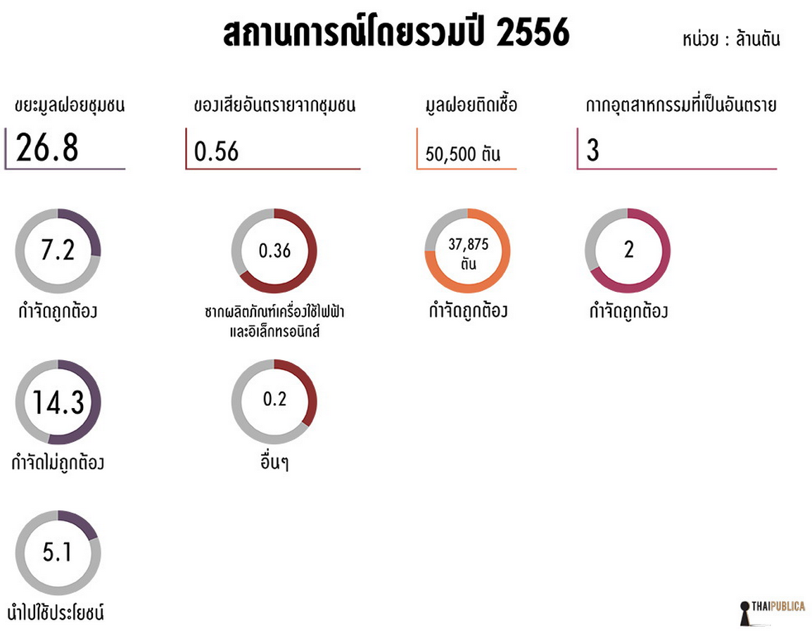 สำหรับประเทศไทย จากการรวบรวมข้อมูลของ Thaipublica (ภาพที่ 2) พบว่าในปี 2556 ปริมาณขยะมูลฝอยจากชุมชนมีปริมาณมากที่สุดคือ 26.8 ล้านตัน ในจำนวนนี้มากกว่ากึ่งหนึ่งมิได้ถูกนำไปกำจัดอย่างถูกต้อง สำหรับของเสียอันตรายพบว่าปริมาณของเสียอันตรายจากชุมชนอยู่ที่ประมาณ 0.56 ล้านตันซึ่งส่วนใหญ่เป็นซากผลิตภัณฑ์สินค้าอิเล็กทรอนิกส์ ส่วนขยะมูลฝอยติดเชื้อมีประมาณ 5 หมื่นตัน และ ขยะอันตรายจากภาคอุตสาหกรรม มีอยู่ประมาณ 3 ล้านตัน