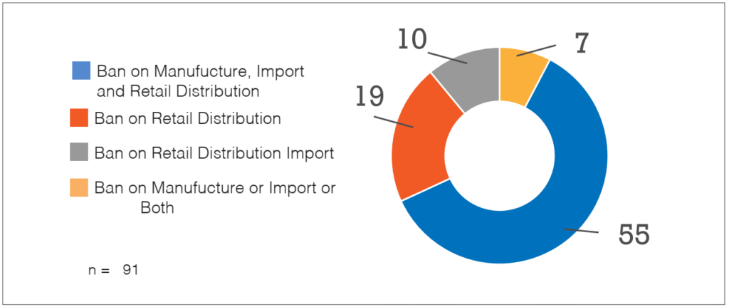3.1.2 ในจำนวนนี้มี 91 ประเทศที่มีกฎหมายห้ามใช้ถุงพลาสติก โดย 55 ประเทศห้ามทั้งการผลิตการนำเข้าและการแจกถุงพลาสติก ในขณะที่ 19 ประเทศห้ามแจกถุงพลาสติกฟรี อีก 10 ประเทศห้ามการนำเข้าและการแจกถุงพลาสติก และ 7 ประเทศสุดท้ายห้ามการผลิตหรือการนำเข้าถุงพลาสติก หรือทั้งสองอย่าง