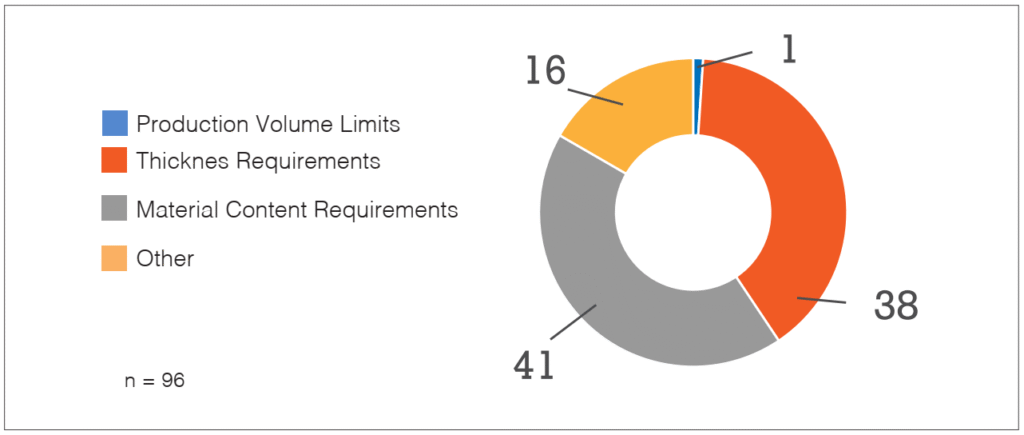 3.1.3 นอกจากนี้มี 96 ประเทศที่มีกฎหมายห้ามใช้ถุงพลาสติกบางส่วน ผ่านทางการกำหนดองค์ประกอบวัสดุถุงพลาสติก 41 ประเทศ การกำหนดความหนาถุงพลาสติก 38 ประเทศ การจำกัดขนาดการผลิตถุงพลาสติก 1 ประเทศ และอื่นๆ เช่น การบังคับให้จัดหาถุงใช้ซ้ำ 16 ประเทศ