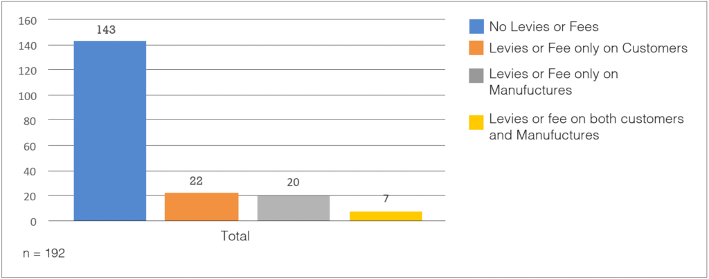 3.1.4 จาก 192 ประเทศ พบว่า 143 ประเทศไม่มีการเก็บภาษีและค่าธรรมเนียมถุงพลาสติก ขณะที่ 22 ประเทศมีการเก็บภาษีหรือค่าธรรมเนียมกับผู้บริโภค ส่วนอีก 20 ประเทศมีการเก็บภาษีหรือค่าธรรมเนียมกับผู้ผลิต และ 7 ประเทศมีการเก็บภาษีหรือค่าธรรมเนียมทั้งจากผู้ผลิตและผู้บริโภค