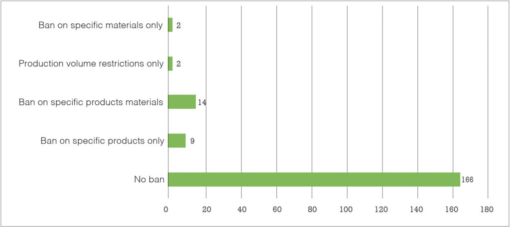 3.2.1 จากการทบทวนกฎหมายของ 192 ประเทศพบว่า ประเทศที่ออกกฎหมายห้ามใช้ผลิตภัณฑ์พลาสติกที่ใช้ครั้งเดียวมีจำนวน 27 ประเทศ โดยแบ่งเป็นการห้ามใช้วัสดุผลิตภัณฑ์ที่เฉพาะเจอะจง 14 ประเทศ การห้ามใช้ผลิตภัณฑ์ที่เฉพาะเจาะจง 9 ประเทศ การห้ามใช้วัสดุที่เฉพาะเจาะจง 2 ประเทศ และการจำกัดปริมาณการผลิต 2 ประเทศ
