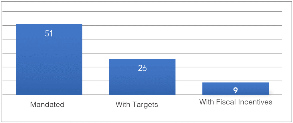 3.2.5 ข้อกำหนดการรีไซเคิลและกฎหมายการจัดการขยะมูลฝอยเป็นมาตรการที่ใช้กันมากที่สุด ในการจัดการผลิตภัณฑ์พลาสติกที่ใช้ครั้งเดียวทั้งในภาคครัวเรือนและการค้า โดยมี 51 ประเทศที่มีข้อกำหนดการรีไซเคิล ซึ่งในจำนวนนี้มี 26 ประเทศที่เป็นการตั้งเป้าหมายการรีไซเคิล และมี 9 ประเทศที่ให้สิ่งจูงใจทางการคลัง