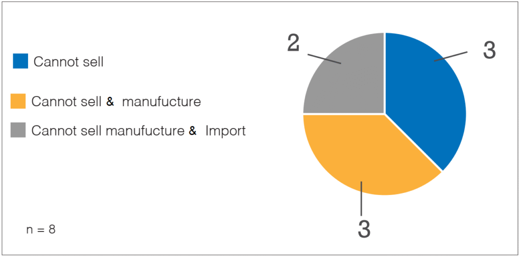 3.3.1 จากการทบทวนกฎหมายของ 192 ประเทศพบว่า ประเทศที่ออกกฎหมายห้ามใส่ไมโครบีดส์มีเพียง 8 ประเทศเท่านั้น (ประมาณ 4%) โดย 7 ประเทศจะควบคุมการใช้และ/หรือการผลิตไมโครบีดส์เฉพาะผลิตภัณฑ์ดูแลส่วนบุคคล (Personal Care Product) เท่านั้น และอีก 1 ประเทศจะรวมถึงผลิตภัณฑ์ทำความสะอาดในอุตสาหกรรม รถยนต์ และครัวเรือนด้วย