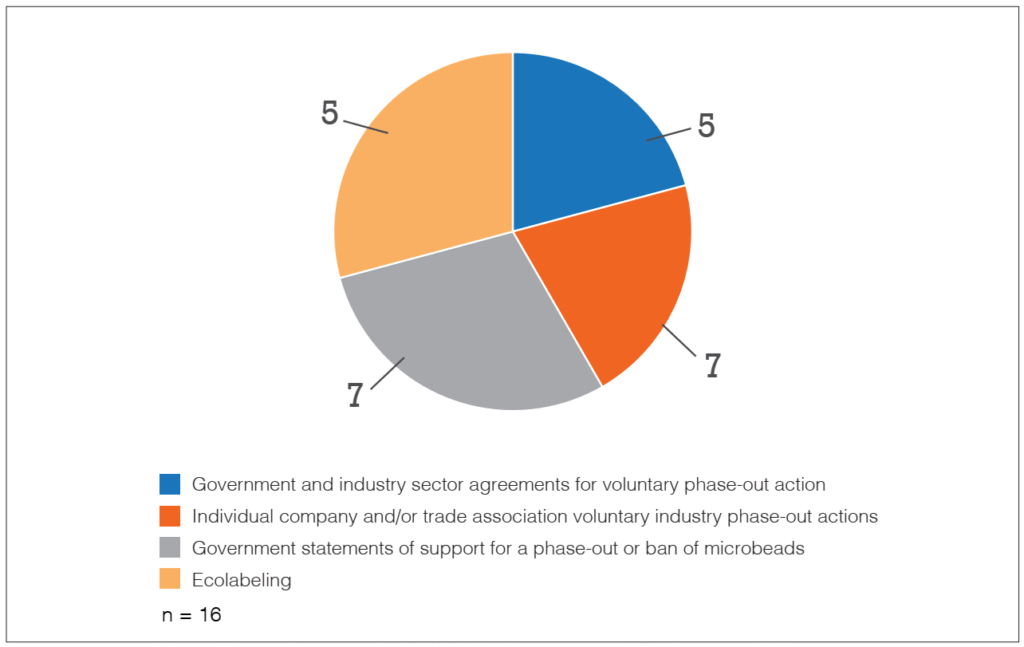3.3.3 นอกเหนือจากกฎหมายระดับชาติแล้ว ยังมีการดำเนินมาตรการสมัครใจเพื่อลดจำนวนผลิตภัณฑ์ที่มีการใส่ไมโครบีดส์ใน 16 ประเทศอีกด้วย โดยแบ่งออกเป็น 4 รูปแบบ ได้แก่ ข้อตกลงระหว่างรัฐบาลกับภาคอุตสาหกรรม 5 ประเทศ ความสมัครใจของบริษัทและ/หรือสมาคมการค้าในภาคอุตสาหกรรม 7 ประเทศ นโยบายสนับสนุนของรัฐบาล 7 ประเทศ และฉลากสิ่งแวดล้อม 5 ประเทศ เป็นต้น