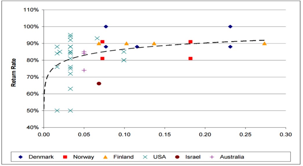 แผนภาพข้างต้นแสดงให้เห็นตัวอย่างอัตราค่าธรรมเนียมล่วงหน้าที่จัดเก็บจากขวดน้ำดื่มในประเทศต่างๆ โดย แกนนอนแสดงอัตราภาษีต่อหน่วยในสกุลเงินปอนด์ ส่วนแกนตั้งแสดงอัตราการนำส่งคืนขวดน้ำ จากภาพก็จะเห็นได้ว่าค่าธรรมเนียมส่งผลต่ออัตราการนำส่งคืนอย่างเห็นได้ชัด ยิ่งอัตรามีความสูงมากขึ้นเท่าใด อัตราการนำส่งคืนก็จะยิ่งเพิ่มมากขึ้นเท่านั้น อย่างไรก็ดีการจัดเก็บค่าธรรมเนียมที่สูงอาจจะกระทบต่อผู้บริโภคที่มีรายได้น้อยได้